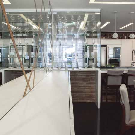 A parede que dividia a sala e jantar da cozinha foi retirada e em seu lugar foi instalada um bancada para as refeições da família no dia-a-dia e uma cristaleira que cria a divisão visual dos ambientes.