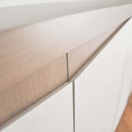 por isso, o armário sob a televisão foi feito com duas cores de MDF e com um formato arredondado, evitando assim que o móvel ficasse muito visualmente pesado.