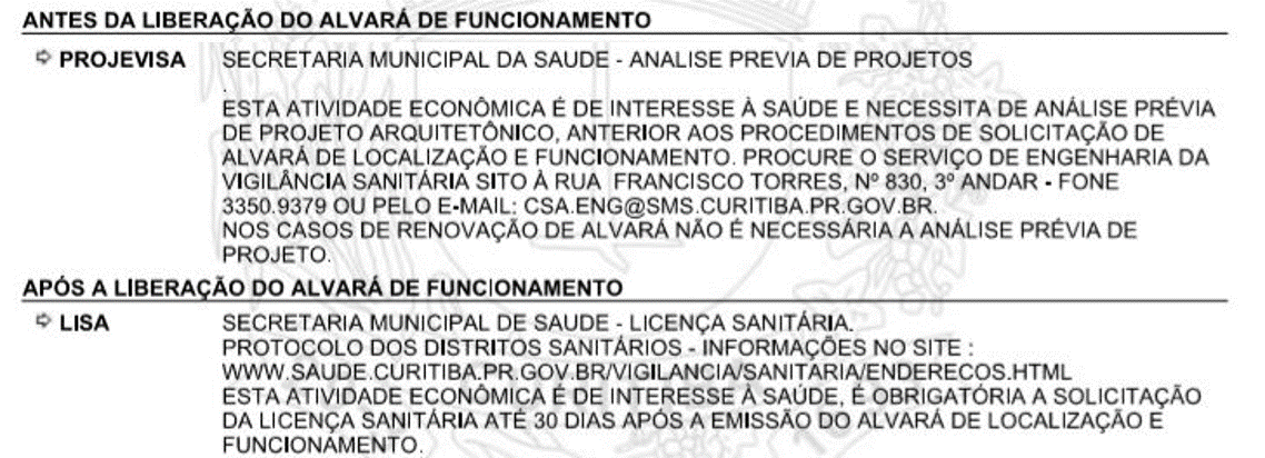 Cada município tem autonomia para determinar como e o que é necessário para os estabelecimentos de interesse à saúde recebam sua licença sanitária, desde que as legislações estaduais e federais também sejam atendidas. Em Curitiba, a Resolução nº01/18 de 12/07/2018 relaciona as atividades econômicas, conforme seu CNAE, que necessitam de análise e avaliação prévia da Vigilância Sanitária Municipal para instalação e início de funcionamento.